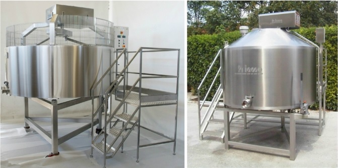 -cuvă de coagulare cilindrică cu ax vertical şi fund plan pentru descărcarea caşului;